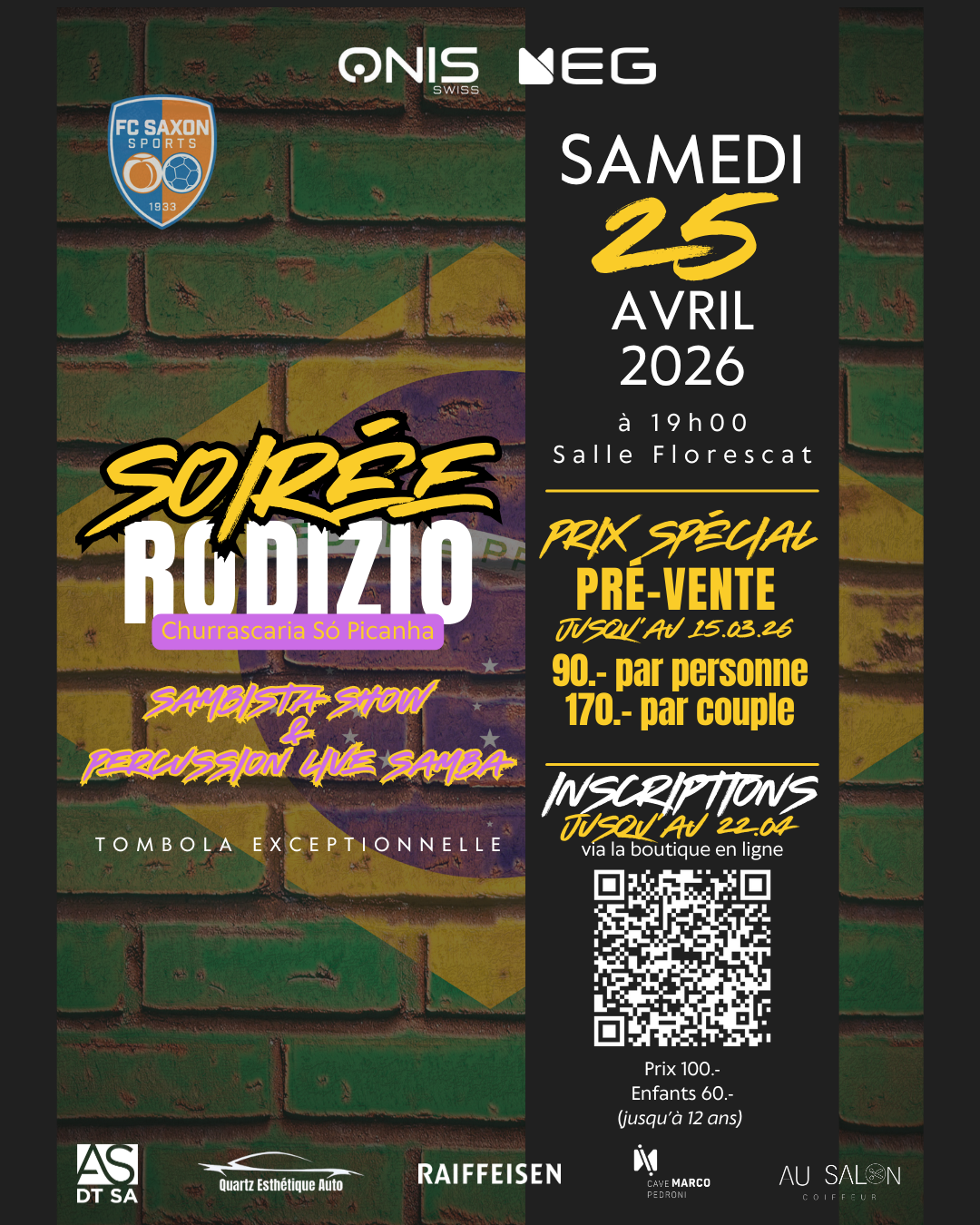 🔸🔷SOUPER DE SOUTIEN FC SAXON SPORTS - ÉDITION 2026 🔷🔸 📅 Samedi 25 avril 2026 Cette année… ON CHANGE TOUT. Place à une soirée 100 % Brésil, 100 % chaleur, 100 % ambiance 🔥🇧🇷 🍖 Rodizio 💃 Show de danseuses samba 🥁 Percussion live de samba 🎶 Une soirée rythmée, conviviale, festive, comme on les aime ! ✨ Une grande première pour le FC Saxon Sports, et on a TELLEMENT hâte de vous faire découvrir ce nouveau concept. 🎟️ PRÉ-VENTE EXCEPTIONNELLE jusqu’au 15 mars 2026 ➡️ Prix spécial couples & personnes seules 👉🏽Tous les prix et infos pratiques se trouvent sur l’affiche 📝 Inscriptions OBLIGATOIRES 📲 Via le QR code 🛒 Ou via la boutique en ligne du FC Saxon Sports ⚠️ Pour des raisons d’organisation, merci de respecter impérativement ce mode de réservation. ❌ Aucune entrée, ni encaissement sur place 🗓️ Vente ouverte jusqu’au 22 avril 🧡💙 On vous attend avec : ✔️ votre bonne humeur ✔️ votre envie de faire la fête ✔️ un bel esprit convivial ✔️ et l’envie de partager un super moment ensemble On se réjouit de vous retrouver et d’inaugurer cette soirée exceptionnelle avec vous 🥳 Vamossss 🇧🇷🔥 #FCSaxonSports #SouperDeSoutien #Rodizio #Samba #Brésil #Ambiance #Convivialité 🧡💙